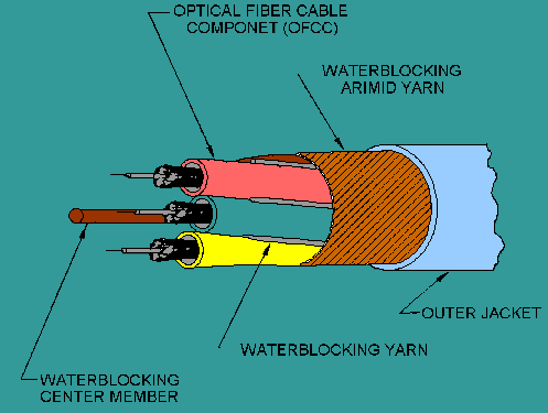Figure 3-15 shows an isometric view of a four-fiber shipboard OFCC cable. In this multifiber cable design, the OFCCs surround a flexible central member in a helical manner. The central member may add to cable strength or only support the OFCCs. For additional protection, two layers of arimid yarn strength members encase the OFCC units. These strength members are stranded in opposing lays to minimize microbending of the fibers. The arimid yarn strength members may be treated with polymers that are water absorbing, blocking, and sealing. This treatment eliminates the need for additional water blocking protection. Finally, a low-halogen, flame-resistant outer jacket is extruded over the strength members. Figure 3-15. - An isometric view of a four-fiber shipboard OFCC cable.