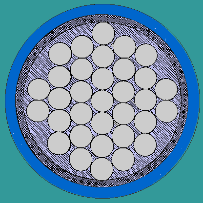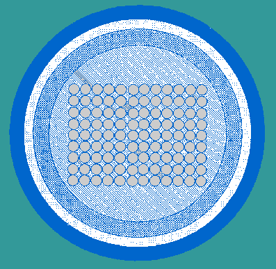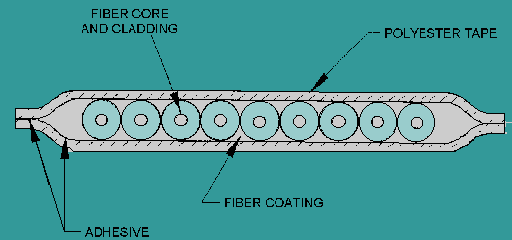 OFCC cables are easy to handle because each cable contains its own subcable, the OFCC. These OFCC subcables make it easy to reconfigure systems and handle individual fibers. Rugged OFCC cable design permits cable use in harsh environments, including Navy applications. OFCC-type cable is recommended for use in low-density (less than 24 fibers) Navy applications. OFCC-type cable is also being evaluated for use in Navy applications with fiber counts up to 36 fibers. Stranded Cable A stranded cable is a fiber optic cable consisting of buffered fibers stranded down the center of the cable surrounded by strength members and a protective jacket. Figure 3-16 shows a cross-sectional view of the stranded cable. The fiber is typically buffered with a polyester elastomer to a total diameter of 900 μm. The recommended use of stranded cables is in medium-density (24 to 72 fibers) Navy applications. However, this recommendation is preliminary. Further test and evaluation of prototype stranded cable designs is continuing. Final approval of the stranded cable will occur only after prototype cables have passed all tests. Figure 3-16. - Stranded cable design. Stranded cable designs increase fiber counts without greatly increasing cable size. Stranded cables are used when fiber counts exceed the limits of OFCC-type cables. For example, the stranded cable design can accommodate about 48 fibers in a O.5-inch cable. The OFCC cable design can accommodate around 12 fibers. The individual fiber is not protected as well in the stranded design as in the OFCC design. For this reason more care is required in handling the individual fibers in the stranded design. The primary problem of the stranded cable design is in meeting the waterblocking requirements. Once manufacturers correct this design problem, the Navy expects that the stranded cable design will meet Navy performance requirements. Ribbon Cable A ribbon cable consists of optical fiber ribbons stranded down the center of the cable surrounded by a protective tube, strength members, and an outer jacket. The fiber optic ribbon consists of multiple-coated, 250 μm diameter fibers sandwiched in a plastic material. Figure 3-17 shows a cross-sectional view of a 12-fiber ribbon. Cable manufacturers stack these ribbons to form a rectangular cross-sectional array of fibers. Stacked ribbons are the basic building blocks of the ribbon cable. Figure 3-18 illustrates this cross-sectional array of ribbons. Manufacturers introduce a controlled twist to the stacked ribbons to minimize fiber stress when the cable is bent. An inner plastic tube, strength members, and an outer protective jacket surround the stacked ribbons, providing environmental protection. Figure 3-17. - Cross section of a fiber optic ribbon. Figure 3-18. - Ribbon cable cross-sectional array of fibers.