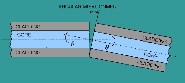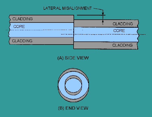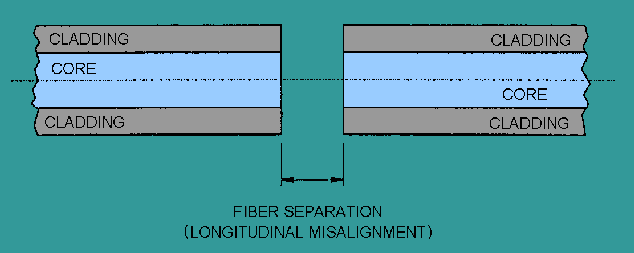 FIBER ALIGNMENT A main source of extrinsic coupling loss in fiber-to-fiber connections is poor fiber alignment. The three basic coupling errors that occur during fiber alignment are fiber separation (longitudinal misalignment), lateral misalignment, and angular misalignment. Most alignment errors are the result of mechanical imperfections introduced by fiber jointing techniques. However, alignment errors do result from installers not following proper connection procedures. With fiber separation, a small gap remains between fiber-end faces after completing the fiber connection. Figure 4-2 illustrates this separation of the fiber-end faces. Figure 4-2. - Fiber separation. Lateral, or axial, misalignment occurs when the axes of the two fibers are offset in a perpendicular direction. Figure 4-3 shows this perpendicular offset of the axes of two connecting fibers. Figure 4-3. - Lateral misalignment. Angular misalignment occurs when the axes of two connected fibers are no longer parallel. The axes of each fiber intersect at some angle (Θ). Figure 4-4 illustrates the angular misalignment between the core axes. Figure 4-4. - Angular misalignment. Coupling loss caused by lateral and angular misalignment typically is greater than the loss caused by fiber separation. Loss, caused by fiber separation, is less critical because of the relative ease in limiting the distance of fiber separation. However, in some cases, fiber optic connectors prevent fibers from actual contact. These fiber optic connectors separate the fibers by a small gap. This gap eliminates damage to fiber-end faces during connection. For connectors with an air gap, the use of index matching gel reduces the coupling loss. Most newer connectors are designed so that the connector ferrule end faces contact when the connector is mated. The connector can be assembled onto the fiber so that the fibers also contact when mated. However, they also can be assembled so that the fibers do not. Whether or not the fibers contact is determined by whether the fiber sticks out slightly from the ferrule or is recessed inside the ferrule. The fiber position can be controlled by the connector polishing technique. The physical contact (PC) polish technique was developed for most connectors so that the fibers would touch when mated. In these types of connectors, index gel is not needed to reduce reflections. While index matching gel reduces coupling loss from fiber separation, it does not affect loss in lateral misalignment. Additionally, index matching gel usually increases the fiber's coupling loss sensitivity to angular misalignment. Although angular misalignment involves fiber separation, index matching gel reduces the angle at which light is launched from the source fiber. Index matching gel causes less light to be coupled into the receiving fiber. To reduce coupling loss from angular misalignment, the angle Θ should be less than 1. Coupling losses due to fiber alignment depend on fiber type, core diameter, and the distribution of optical power among propagating modes. Fibers with large NAs reduce loss from angular misalignment and increase loss from fiber separation. Single mode fibers are more sensitive to alignment errors than multimode fibers because of their small core size. However, alignment errors in multimode fiber connections may disturb the distribution of optical power in the propagating modes, increasing coupling loss. Q.7 List the three basic errors that occur during fiber alignment. |