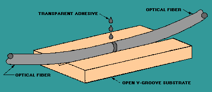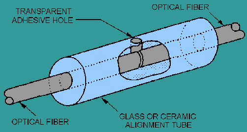 MECHANICAL SPLICES Mechanical splicing involves using mechanical fixtures to align and connect optical fibers. Mechanical splicing methods may involve either passive or active core alignment. Active core alignment produces a lower loss splice than passive alignment. However, passive core alignment methods can produce mechanical splices with acceptable loss measurements even with single mode fibers. In the strictest sense, a mechanical splice is a permanent connection made between two optical fibers. Mechanical splices hold the two optical fibers in alignment for an indefinite period of time without movement. The amount of splice loss is stable over time and unaffected by changes in environmental or mechanical conditions. If high splice loss results from assembling some mechanical splices, the splice can be reopened and the fibers realigned. Realignment includes wiping the fiber or ferrule end with a soft wipe, reinserting the fiber or ferrule in a new arrangement, and adding new refractive index material. Once producing an acceptable mechanical splice, splice realignment should be unnecessary because most mechanical splices are environmentally and mechanically stable within their intended application. The types of mechanical splices that exist for mechanical splicing include glass, plastic, metal, and ceramic tubes; and V-groove and rotary devices. Materials that assist mechanical splices in splicing fibers include transparent adhesives and index matching gels. Transparent adhesives are epoxy resins that seal mechanical splices and provide index matching between the connected fibers. Glass or Ceramic Alignment Tube Splices Mechanical splicing may involve the use of a glass or ceramic alignment tube, or capillary. The inner diameter of this glass or ceramic tube is only slightly larger than the outer diameter of the fiber. A transparent adhesive, injected into the tube, bonds the two fibers together. The adhesive also provides index matching between the optical fibers. Figure 4-9 illustrates fiber alignment using a glass or ceramic tube. This splicing technique relies on the inner diameter of the alignment tube. If the inner diameter is too large, splice loss will increase because of fiber misalignment. If the inner diameter is too small, it is impossible to insert the fiber into the tube. Figure 4-9. - A glass or ceramic alignment tube for mechanical splicing.