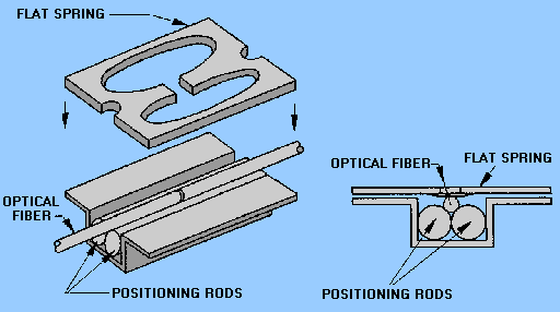 V-Grooved Splices Mechanical splices may also use either a grooved substrate or positioning rods to form suitable V-grooves for mechanical splicing. The basic V-grooved device relies on an open grooved substrate to perform fiber alignment. When inserting the fibers into the grooved substrate, the V-groove aligns the cladding surface of each fiber end. A transparent adhesive makes the splice permanent by securing the fiber ends to the grooved substrate. Figure 4-10 illustrates this type of open V-grooved splice. Figure 4-10. - Open V-grooved splice. V-grooved splices may involve sandwiching the butted ends of two prepared fibers between a V-grooved substrate and a flat glass plate. Additional V-grooved devices use two or three positioning rods to form a suitable V-groove for splicing. The V-grooved device that uses two positioning rods is the spring V-grooved splice. This splice uses a groove formed by two rods positioned in a bracket to align the fiber ends. The diameter of the positioning rods permits the outer surface of each fiber end to extend above the groove formed by the rods. A flat spring presses the fiber ends into the groove maintaining fiber alignment. Transparent adhesive completes the assembly process by bonding the fiber ends and providing index matching. Figure 4-11 is an illustration of the spring V-grooved splice. A variation of this splice uses a third positioning rod instead of a flat spring. The rods are held in place by a heat-shrinkable band, or tube. Figure 4-11. - Spring V-grooved mechanical splice. Rotary Splices In a rotary splice, the fibers are mounted into a glass ferrule and secured with adhesives. The splice begins as one long glass ferrule that is broken in half during the assembly process. A fiber is inserted into each half of the tube and epoxied in place using an ultraviolet cure epoxy. The endface of the tubes are then polished and placed together using the alignment sleeve. Figure 4-12 is an illustration of a rotary splice. The fiber ends retain their original orientation and have added mechanical stability since each fiber is mounted into a glass ferrule and alignment sleeve. The rotary splice may use index matching gel within the alignment sleeve to produce low-loss splices. Figure 4-12. - Rotary mechanical splice. In shipboard applications, the Navy recommends using the rotary splice. The rotary splice is a low-loss mechanical splice that provides stable environmental and mechanical performance in the Navy environment. Stable performance means that splice loss does not vary significantly with changes in temperature or other environmental or mechanical conditions. Completing a rotary splice also requires only a small amount of training, or expertise. This shorter training time is another reason why the Navy recommends using the rotary splice over other mechanical or fusion splicing techniques. Q.18 Describe a transparent adhesive. |