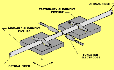 FUSION SPLICES The process of fusion splicing involves using localized heat to melt or fuse the ends of two optical fibers together. The splicing process begins by preparing each fiber end for fusion. Fusion splicing requires that all protective coatings be removed from the ends of each fiber. The fiber is then cleaved using the score-and-break method. The quality of each fiber end is inspected using a microscope. In fusion splicing, splice loss is a direct function of the angles and quality of the two fiber-end faces. The basic fusion splicing apparatus consists of two fixtures on which the fibers are mounted and two electrodes. Figure 4-13 shows a basic fusion-splicing apparatus. An inspection microscope assists in the placement of the prepared fiber ends into a fusion-splicing apparatus. The fibers are placed into the apparatus, aligned, and then fused together. Initially, fusion splicing used nichrome wire as the heating element to melt or fuse fibers together. New fusion-splicing techniques have replaced the nichrome wire with carbon dioxide (CO2) lasers, electric arcs, or gas flames to heat the fiber ends, causing them to fuse together. The small size of the fusion splice and the development of automated fusion-splicing machines have made electric arc fusion (arc fusion) one of the most popular splicing techniques in commercial applications. Figure 4-13. - A basic fusion splicing apparatus. Arc fusion involves the discharge of electric current across a gap between two electrodes. By placing the fiber ends between the electrodes, the electric discharge melts or fuses the ends of each fiber. Figure 4-13 shows the placement of the fiber ends between tungsten electrodes during arc fusion. Initially, a small gap is present between the fiber ends. A short discharge of electric current is used to prepare the fiber ends for fusion. During this short discharge, known as prefusion, the fiber ends are cleaned and rounded to eliminate any surface defects that remain from fiber cleaving. Surface defects can cause core distortions or bubble formations during fiber fusion. A fusion splice results when the fiber ends are pressed together, actively aligned, and fused using a longer and stronger electric discharge. Automated fusion splicers typically use built-in local optical power launch/detection schemes for aligning the fibers. During fusion, the surface tension of molten glass tends to realign the fibers on their outside diameters, changing the initial alignment. When the fusion process is complete, a small core distortion may be present. Small core distortions have negligible effects on light propagating through multimode fibers. However, a small core distortion can significantly affect single mode fiber splice loss. The core distortion, and the splice loss, can be reduced by limiting the arc discharge and decreasing the gap distance between the two electrodes. This limits the region of molten glass. However, limiting the region of molten glass reduces the tensile strength of the splice. Fusion splicing yields typically vary between 25 and 75 percent depending on the strength and loss requirements for the splice and other factors. Other factors affecting splice yields include the condition of the splicing machine, the experience of the splice personnel, and environmental conditions. Since fusion splicing is inherently permanent, an unacceptable fusion splice requires breakage and refabrication of the splice. In general, fusion splicing takes a longer time to complete than mechanical splicing. Also, yields are typically lower making the total time per successful splice much longer for fusion splicing. Both the yield and splice time are determined to a large degree by the expertise of the fusion splice operator. Fusion splice operators must be highly trained to consistently make low-loss reliable fusion splices. For these reasons the fusion splice is not recommended for use in Navy shipboard applications. Q.20 What fiber property directly affects splice loss in fusion splicing? |