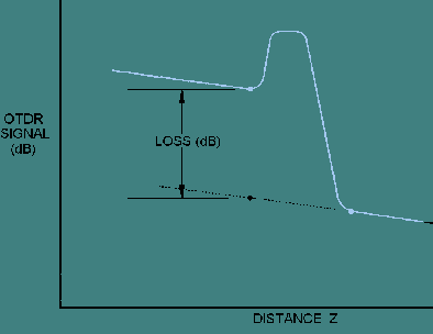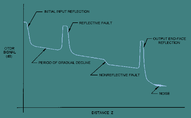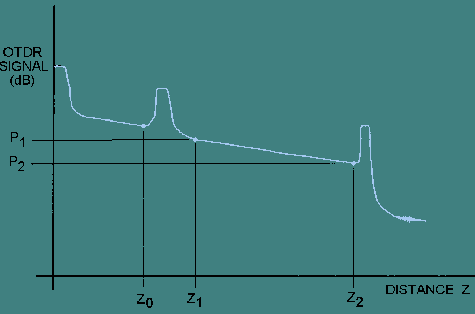 Optical Time-Domain Reflectometry End users use optical time-domain reflectometry to characterize optical fiber and optical connection properties in the field. In optical time-domain reflectometry, an OTDR transmits an optical pulse through an installed optical fiber. The OTDR measures the fraction of light that is reflected back due to Rayleigh scattering and Fresnel reflection. By comparing the amount of light scattered back at different times, the OTDR can determine fiber and connection losses. When several fibers are connected to form an installed cable plant, the OTDR can characterize optical fiber and optical connection properties along the entire length of the cable plant. A fiber optic cable plant consists of optical fiber cables, connectors, splices, mounting panels, jumper cables, and other passive components. A cable plant does not include active components such as optical transmitters or receivers. The OTDR displays the backscattered and reflected optical signal as a function of length. The OTDR plots half the power in decibels (dB) versus half the distance. Plotting half the power in dB and half the distance corrects for round trip effects. By analyzing the OTDR plot, or trace, end users can measure fiber attenuation and transmission loss between any two points along the cable plant. End users can also measure insertion loss and reflectance of any optical connection. In addition, end users use the OTDR trace to locate fiber breaks or faults. Figure 5-13 shows an example OTDR trace of an installed cable plant. OTDR traces can have several common characteristics. An OTDR trace begins with an initial input pulse. This pulse is a result of Fresnel reflection occurring at the connection to the OTDR. Following this pulse, the OTDR trace is a gradual downsloping curve interrupted by abrupt shifts. Periods of gradual decline in the OTDR trace result from Rayleigh scattering as light travels along each fiber section of the cable plant. Periods of gradual decline are interrupted by abrupt shifts called point defects. A point defect is a temporary or permanent local deviation of the OTDR signal in the upward or downward direction. Point defects are caused by connectors, splices, or breaks along the fiber length. Point defects, or faults, can be reflective or nonreflective. An output pulse at the end of the OTDR trace indicates the end of the fiber cable plant. This output pulse results from Fresnel reflection occurring at the output fiber-end face. Figure 5-13. - OTDR trace of an installed cable plant. ATTENUATION. - The fiber optic test method for measuring the attenuation of an installed optical fiber using an OTDR is EIA/TIA-455-61. The accuracy of this test method depends on the user entering the appropriate source wavelength, pulse duration, and fiber length (test range) into the OTDR. In addition, the effective group index of the test fiber is required before the attenuation coefficient and accurate distances can be recorded. The group index (N) is provided by fiber manufacturers or is found using EIA/TIA-455-60. By entering correct test parameters, OTDR fiber attenuation values will closely coincide with those measured by the cutback technique. Test personnel can connect the test fiber directly to the OTDR or to a dead-zone fiber. This dead-zone fiber is placed between the test fiber and OTDR to reduce the effect of the initial reflection at the OTDR on the fiber measurement. The dead-zone fiber is inserted because minimizing the reflection at a fiber joint is easier than reducing the reflection at the OTDR connection. Figure 5-14 illustrates the OTDR measurement points for measuring the attenuation of the test fiber using a dead-zone fiber. Fiber attenuation between two points along the test fiber is measured on gradual downsloping sections on the OTDR trace. There should be no point defects present along the portion of fiber being tested. Figure 5-14. - OTDR measurement points for measuring fiber attenuation using a dead-zone fiber. OTDRs are equipped with either manual or automatic cursors to locate points of interest along the trace. In figure 5-14, a cursor is positioned at a distance zo on the rising edge of the reflection at the end of the dead-zone fiber. Cursors are also positioned at distances z1 and z2. The cursor positioned at z1 is just beyond the recovery from the reflection at the end of the dead-zone fiber. Since no point defects are present in figure 5-14, the cursor positioned at z2 locates the end of the test fiber. Cursor z2 is positioned just before the output pulse resulting from Fresnel reflection occurring at the end of the test fiber. The attenuation of the test fiber between points z1 and z2 is (P1 - P2) dB. The attenuation coefficient (α) is