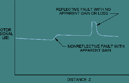 POINT DEFECTS. - Point defects are temporary or local deviations of the OTDR signal in the upward or downward direction. A point defect, or fault, can be reflective or nonreflective. A point defect normally exhibits a loss of optical power. However, a point defect may exhibit an apparent power gain. In some cases, a point defect can even exhibit no loss or gain. Refer back to figure 5-13; it illustrates a reflective fault and a nonreflective fault, both exhibiting loss. Figure 5-15 shows a nonreflective fault with apparent gain and a reflective fault with no apparent loss or gain. Figure 5-15. - An OTDR trace showing a nonreflective fault with apparent gain and a reflective fault with no apparent loss or gain.