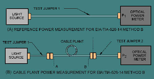 Power Meter Test personnel also use an optical power meter and stabilized light source to measure fiber attenuation and transmission loss in the field. Optical power meter measurements are recommended when the length of an installed optical fiber cable or cable plant is less than 50 meters. A test jumper is used to couple light from the stabilized source to one end of the optical fiber (or cable plant) under test. An additional test jumper is also used to connect the other end of the optical fiber (or cable plant) under test to the power meter. Optical power meter measurements may be conducted using an optical loss test set (OLTS). An OLTS combines the power meter and source functions into one physical unit. When making measurements, it does not matter whether the stabilized source and power meter are in one physical unit or two. Power meter measurements are conducted on individual optical fiber cables installed on board ship. The installed optical fiber cable must have connectors or terminations on both ends to make the measurement. If the installed optical fiber cable does not have connectors or terminations on both ends, an OTDR should be used to evaluate the cable. If the cable is too short for evaluation with an OTDR, cable continuity can be verified using a flashlight. Power meter measurements for cable assembly link loss require that test personnel clean all optical connections at test jumper interfaces before performing any measurement. Test personnel should use cotton wipes dampened with alcohol to clean connectors and blow dry before making connections. End users should also ensure that test equipment calibration is current. Power meter measurements connecting a test reference cable between the light source and power meter. The test reference cable has the same nominal fiber characteristics as the cable under test. The optical power present at the power meter is the reference power (P1). Disconnect the test reference cable and connect the optical fiber cable under test between the light source and power meter using test jumpers. If possible, the test reference cable should be used as the input jumper cable for the test cable measurement. The test jumper fiber properties, such as core diameter and NA, should be nominally equal to the fiber properties of the cable being tested. The optical power present at the power meter is test power (P2). Test personnel use P1 and P2 to calculate the cable assembly link loss. The cable assembly link loss (BCA) of optical fiber installed with connectors or terminations on both ends is