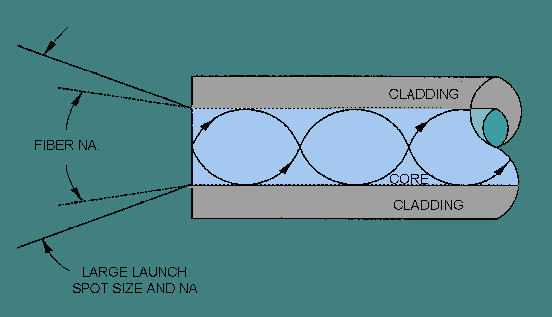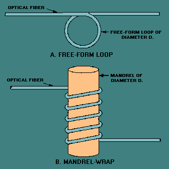 L is the distance between points X and Y. α is a positive number because Px is always larger than Py. The attenuation coefficient will also vary with changes in λ. CUTBACK METHOD. - In laboratory situations, end users perform the cutback method for measuring the total attenuation of an optical fiber. The cutback method involves comparing the optical power transmitted through a long piece of test fiber to the power present at the beginning of the fiber. The cutback method for measuring multimode fiber attenuation is EIA/TIA-455-46. The cutback method for measuring single mode fiber attenuation is EIA/TIA-455-78. The basic measurement process is the same for both of these procedures. The test method requires that the test fiber of known length (L) be cut back to an approximate 2-m length. This cut back causes the destruction of 2-m of fiber. This method requires access to both fiber ends. Each fiber end should be properly prepared to make measurements. EIA/TIA-455-57 describes how to properly prepare fiber ends for measurement purposes. Figure 5-1 illustrates the cutback method for measuring fiber attenuation. The cutback method begins by measuring, with an optical power meter, the output power P1 of the test fiber of known length (L) (figure 5-1, view A). Without disturbing the input light conditions, the test fiber is cut back to an approximate 2-m length. The output power P2 of the shortened test fiber is then measured (figure 5-1, view B). The fiber attenuation AT and the attenuation coefficient α are then calculated. Figure 5-1. - Cutback method for measuring fiber attenuation: A. Test measurement; B. Cut-back measurement. LAUNCH CONDITIONS. - Measurement personnel must pay attention to how optical power is launched into the fiber when measuring fiber attenuation. Different distributions of launch power (launch conditions) can result in different attenuation measurements. This is more of a problem with multimode fiber than single mode fiber. For single mode fiber, optical power must be launched only into the fundamental mode. This is accomplished using a mode filter on the fiber. For multimode fiber, the distribution of power among the modes of the fiber must be controlled. This is accomplished by controlling the launch spot size and angular distribution. The launch spot size is the area of the fiber face illuminated by the light beam from the optical source. The diameter of the spot depends on the size of the optical source and the properties of the optical elements (lenses, and so on) between the source and the fiber end face. The angular distribution is the angular extent of the light beam from the optical source incident on the fiber end face. The launch angular distribution also depends on the size of the optical source and the properties of the optical elements between the optical source and the fiber end face. Multimode optical fiber launch conditions are typically characterized as being underfilled or overfilled. An underfilled launch concentrates most of the optical power in the center of the fiber. An underfilled launch results when the launch spot size and angular distribution are smaller than that of the fiber core. Underfilling the fiber excites mainly low-order modes. Figure 5-2 illustrates an underfilled launch condition. Figure 5-2. - Underfilled launch condition. Overfilling the fiber excites both low-order and high-order modes. Figure 5-3 illustrates an overfilled launch condition. An overfilled launch condition occurs when the launch spot size and angular distribution are larger than that of the fiber core. Incident light that falls outside the fiber core is lost. In addition, light that is incident at angles greater than the angle of acceptance of the fiber core is lost. Figure 5-3. - Overfilled launch condition. In attenuation measurements, cladding-mode strippers and mode filters eliminate the effects that high-order modes have on attenuation results. A cladding-mode stripper is a device that removes any cladding mode power from the fiber. Most cladding-mode strippers consist of a material with a refractive index greater than that of the fiber cladding. For most fibers, the fiber coating acts as an excellent cladding-mode stripper. A mode filter is a device that attenuates specific modes propagating in the core of an optical fiber. Mode filters generally involve wrapping the test fiber around a mandrel. For multimode, tight bends tend to remove high-order modes from the fiber. This type of mode filter is known as a mandrel wrap mode filter. For multimode fibers, mode filters remove high-order propagating modes and are individually tailored and adjusted for a specific fiber type. For single mode fibers, a mode filter is used to eliminate the second-order mode from propagating along the fiber. The propagation of the second-order mode will affect attenuation measurements. Fiber attenuation caused by the second-order mode depends on the operating wavelength, the fiber bend radius and length. The two most common types of mode filters are free-form loops and mandrel wraps. Figure 5-4 illustrates the free-form loop and mandrel-wrap types of mode filters. Mandrel wraps for multimode fibers consist of several wraps (approximately 4 or 5) around a mandrel. A 20-mm diameter mandrel is typically used for 62.5 μm fiber. Mandrel wraps for single mode fibers consist of a single wrap around a 30-mm diameter mandrel. Another common mode filter for single mode fibers is a 30-mm diameter circular free-form loop. Additional information on multimode and single mode filters (and launch conditions) is available in EIA/TIA-455-50 and EIA/TIA-455-77, respectively. Figure 5-4. - Types of mode filters: A. Free-form loop; B. Mandrel-wrap.