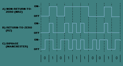 DIGITAL TRANSMISSION A digital signal is a discontinuous signal that changes from one state to another in discrete steps. A popular form of digital modulation is binary, or two level, digital modulation. In binary modulation the optical signal is switched from a low-power level (usually off) to a high-power level. There are a number of modulation techniques used in digital systems, but these will not be discussed here. For more information on digital modulation techniques, refer to the References listed in appendix 2. Line coding is the process of arranging symbols that represent binary data in a particular pattern for transmission. The most common types of line coding used in fiber optic communications include non-return-to-zero (NRZ), return-to-zero (RZ), and biphase, or Manchester. Figure 8-6 illustrates NRZ, RZ, and biphase (Manchester) encoding. Figure 8-6. - NRZ, RZ, and biphase (Manchester) encoding. NRZ code represents binary 1s and 0s by two different light levels that are constant during a bit duration. The presence of a high-light level in the bit duration represents a binary 1, while a low-light level represents a binary 0. NRZ codes make the most efficient use of system bandwidth. However, loss of timing may result if long strings of 1s and 0s are present causing a lack of level transitions. RZ coding uses only half the bit duration for data transmission. In RZ encoding, a half period optical pulse present in the first half of the bit duration represents a binary 1. While an optical pulse is present in the first half of the bit duration, the light level returns to zero during the second half. A binary 0 is represented by the absence of an optical pulse during the entire bit duration. Because RZ coding uses only half the bit duration for data transmission, it requires twice the bandwidth of NRZ coding. Loss of timing can occur if long strings of 0s are present. Biphase, or Manchester, encoding incorporates a transition into each bit period to maintain timing information. In Manchester encoding, a high-to-low light level transition occurring in the middle of the bit duration represents a binary 1. A low-to-high light level transition occurring in the middle of the bit duration represents a binary 0. For further information on digital encoding schemes and modulation techniques, refer to the reference material listed in appendix 2. Digital transmission offers an advantage with regard to the acceptable signal-to-noise ratio (SNR) at the optical receiver. Digital communications systems can tolerate large amounts of signal loss and dispersion without impairing the ability of the receiver to distinguish a binary 1 from a binary 0. Digital signalling also reduces the effects that optical source nonlinearities and temperature have on system performance. Source nonlinearities and temperature variations can severely affect analog transmission. Digital transmission provides superior performance in most complex systems (such as LANs) and long-haul communications systems. In short-haul systems, the cost and complexity of analog-to-digital and digital-to-analog conversion equipment, in some cases, outweigh the benefits of digital transmission. Q.5 What is a digital signal? |