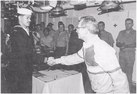 302.277 Figure 6-6. Award presented by the former Secretary of Defense Frank C. Carlucci The reenlistee, retiree, or person being advanced, promoted, or receiving an award is always the subject (fig. 6-6). Regardless of who is presenting the award or conducting the ceremony (whether it be the division officer, commanding officer, or the Secretary of Defense), the recipient is always the center of interest. Avoid profile photographs of the subject. If necessary, shoot over the shoulder of the person presenting the award or conducting the ceremony. Prevent objects from giving the appearance of protruding from a person's head or body, such as pipes, flags, or doorframes. Always view the entire subject through the viewfinder and adjust your camera angle or viewpoint as necessary to prevent this compositional flaw. If you miss a shot or you know the photograph does not meet your standards, such as eyes closed, face hidden, or flash does not fire, always re-shoot the photograph. When it is not possible to re-shoot immediately, setup and re-shoot after the ceremony. When in doubt, re-shoot. Film is relatively cheap, but your reputation and the reputation of the photo lab is not. Never fake a shot. If you run out of film or have camera problems, make arrangements to take photographs at a later time. Better planning and improved communication will normally prevent this from happening. |