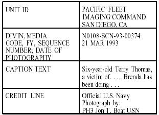 Your skill as a caption writer, like any endeavor, will improve with practice. When you write a caption, have the photograph in front of you. This may help you recall just what was taking place. Avoid phrases, such as- Shown above, This is a picture of. . . . or Posing for the camera . . . . These phrases insult the reader's intelligence. When writing captions, you should always be alert to point out interesting or important things in the photograph that might escape the casual reader. Remember to spell out the meaning of all unfamiliar abbreviations. PHAA may mean Photographer's Mate Airman Apprentice to you, but it may be meaningless to the reader. Finally, you must remember that the caption should supplement the photograph, not duplicate with words what is readily evident in the photograph. Captions should always be typed, preferably double spaced, on a separate sheet of paper, such as crack-and-peel stickers or plain, white paper, and affixed to the back of the photograph. When using plain, white paper to prepare and attach a caption to a photo, first type the caption on the bottom of a sheet of paper. Cut off most of the unused portion and fold just above the typing. Attach the caption to the back of the photo with tape so the typed caption folds over the bottom and lies against the face of the photo. When unfolded, the caption is properly positioned at the bottom of the photo. |