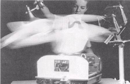 Figure 6-11. Using painted light. useful range between highlights and shadows, in which the film can record detail, must be established. This useful range depends completely on the reflectance range of the subject. With most color films, this range between highlights and shadows must be kept within five f/stops. This means a ratio of about 32:1. Any area of the subject (except specular highlights) that is outside of this range is reproduced either too light or too dark in the final picture. A reflected light meter can be used to find the relationship between the useful or desired diffused highlight and the darkest desired shadow. A difference of two f/stops is a scene contrast of 4: 1; four stops is a 16:1 contrast. Most black-and-white film can record both highlight and shadow detail when this range is not greater than about six f/stops. Painted Light Painted light (fig. 6-11) is one of the best ways to obtain even illumination and soft shadows. With this type of lighting, only one light is used. The light is moved constantly up and down and around the subject and its background. Painted light is effective for illuminating subjects made up of many smaller parts that cast shadows onto adjacent parts, such as printed circuits or the inside of a radio. When you are using the painted light technique, the exposure must be increased by a factor of 3. To determine the painted light exposure, hold the light stationary at the same distance it will be used from the subject. Read the exposure with your light meter. Multiply the exposure time indicated by the meter by 3, the painted light factor. Example: With the light meter, you have determined the exposure to be 6 seconds. Multiply the exposure time, 6 seconds, by the painted light factor, 3 (6 x 3 = 18 seconds). The minimum exposure time required when using painted light is 10 seconds. An exposure of less than 10 seconds does not give the photographer enough time to illuminate the subject evenly. |
