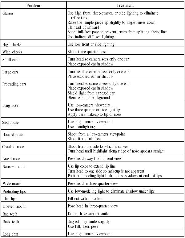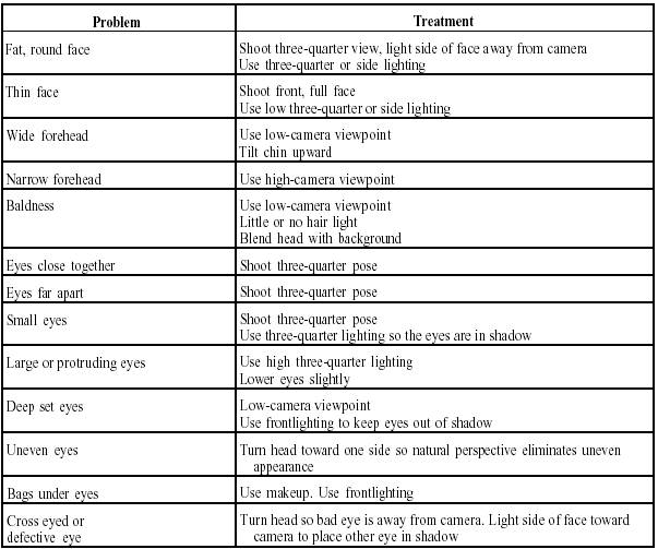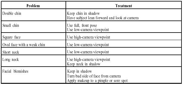 Normally, the exposure for portraits should be based on the fill light alone as measured at the subject position. The fill light is the single source of illumination to the shadow areas and image detail in the shadow areas. Table 7-1. Corrective Treatments