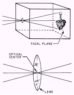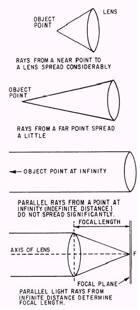 Figure 1-18. Effects of lens-to-subject distance on light rays. Focal plane-The surface (plane) on which an image transmitted by a lens is brought to sharp focus; the surface or area at the back of the camera occupied by the film.