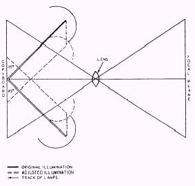 Figure 8-4. Lighting large originals. Kelvin Temperature of Illumination When you are producing color copies, the Kelvin temperature (color) of the light source should match the color balance of the color film being used. When a light source produces an illumination color other than that for which a color film is balanced, filters must be used to alter the Kelvin temperature of the illumination to correspond with the color balance of the film. Rises and drops in voltage also affect the color temperature and intensity of illumination. Fluctuation in voltage can be controlled by using a voltage regulator. Lighting Large Originals For most copy work, you should position the lights at a 45-degree angle, about 36 inches from the copyboard, and aimed at the center of the original. However, there are occasions when you may have to copy a large chart, and the normal lighting setup causes uneven illumination. Light from an artificial source must travel farther to reach the center of the original, and the light reflected from the edges must travel farther to reach the lens. This causes the light to be less intense along the edges and may result in underexposure of these areas. You can correct this condition by adjusting the lights. Keep the lights at a 45-degree angle, but move them closer to the lens optical axis until the light beams from the lamps intersect in front of the original (fig. 8-4). Balance is generally achieved when the beams cross each other at a point approximately one third of the distance from the copyboard to the lens. Check the lighting on the ground glass or through the viewfinder to see whether it is even from the center to the outer edges. When lighting large copy, the use of portrait lights with umbrellas is a good source of illumination. The wide coverage and diffused light, produced from this light source, allows you to light the original easily and evenly. To check the evenness of the lighting, use a flash meter and take readings from the center, corners, and intermediate points on the original. Reflection Control Unwanted reflections often affect copying. Proper placement of the lights is generally sufficient to eliminate most normal reflections. The three types of unwanted reflections in copy work are as follows: Reflections from the light source Reflections over the entire surface of the original or copyboard Optical flare Reflections from the light source are caused by light reflecting from the camera stand, lens board, cable release, or other shiny objects around the copy setup. The reflections usually occur when you are copying glass-covered originals, glossy photographs, or other smooth-surfaced originals. The best way to eliminate this type of reflection (when changing the position of the lights does not help) is to use a black cloth or a sheet of cardboard (painted dull black) as a shield between the lens and copyboard. You can do this by cutting a hole the size of the lens in the center of the cloth or board then placing the cloth or board over or around the lens. A lens hood also helps in reducing or eliminating this type of reflection. Reflections over the entire surface of an original can occur with rough, scratched, crumpled prints or paintings with brush marks, canvas texture, cracks, and so forth. These reflections are caused by high spots on the surface of the original and cause small light reflections of the light source. Such small reflections cover the surface of the original with a haze of light that results in a low-contrast copy image. Reflections of this type are more difficult to avoid than reflections of the light source. As long as the lights shine directly on the rough surface, such reflections occur no matter in what position the lights are placed. There are two lighting methods by which this type of reflection can be minimized or eliminated. These methods are bounce lighting and polarized lighting.