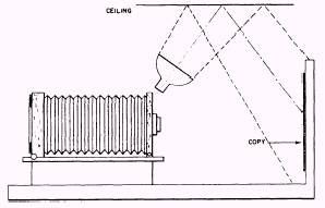 Figure 8-5. Using bounce light to control reflections. BOUNCE LIGHTING. When a white surface is low enough, you should direct the light sources upward so diffused light bounces off the surface onto the original (fig. 8-5). When the surface is too high or other than white, it may be possible to use a white reflector positioned horizontally over the upturned lights. This reflector could be a large sheet of white cardboard. POLARIZED LIGHTING. The most efficient method of eliminating unwanted reflections in copy work is by using polarized light. In regular photography, a polarizing filter is placed over the camera lens to subdue reflections. This works because the light from the sun is polarized as it passes through the atmosphere and is reflected by the object being photographed. Using a polarizing filter over the lens only does not greatly reduce unwanted reflections in copy work. In copying, polarizing screens must be used over the lights as well as a polarizing filter over the lens. When polarized light is used in copying, a considerable increase in exposure is required. This exposure increase is from about 10 to 16 times the normal exposure required with the same lights without polarizing screens. The exact increase is best deter-mined through a series of exposure tests. Reflections caused by flare are common with dirty or poor quality lenses. When available, lenses designed for copy work should be used, and like all lenses, they should always be kept clean. |