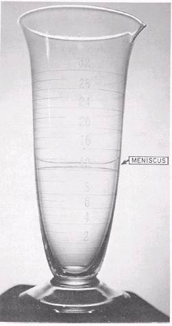 Chemicals should always be mixed in cylindrical containers made of suitable materials, The size of the mixing container should be suitable for the amount of solution to be prepared. A small batch of solution should not be mixed in a large vessel that uses mechanical agitation because large amounts of air may be introduced, and splashing may occur. So, the mixing container, and for that matter, scales and graduates, should be sized to the quantities and volumes of solutions required. GRADUATES Graduates are used to measure liquids. Graduates are made in various sizes, calibrations, and of various materials. The units of measure of graduates are calibrated in the U.S. liquid measurement system of ounces, quarts, and gallons, and in the metric liquid measurement system of cubic centimeters, milliliters, and liters. Glass is most commonly used for making graduates because it is NOT affected by most chemicals. Glass is also transparent and reasonably durable. Graduates are also made from plastic and stainless steel. When using graduates made of plastic, do not try to measure strong acids, such as sulfuric acid, which could cause severe damage. You must also be sure that the material the graduate is made of does not react with any of your photographic chemicals. For accuracy in measuring liquids, graduates should be proportional in size to the quantity of solution being measured; for example, an 8-ounce graduate should be used instead of a 32-ounce graduate to measure 2 or 3 ounces. When measuring a liquid in a glass graduate, hold it at eye level and pour the solution into it until the surface of the liquid reaches the correct mark. You will notice a curved surface on the top of the solution. This curved surface is called the meniscus. The correct amount is indicated by the lower of two visible lines of the meniscus (fig. 9-1). These two lines can be seen easily through the side of a glass graduate when it is held correctly. With an opaque graduate, such as stainless steel, the two lines can be seen by looking down into the graduate from an angle. Stop pouring the solution when the lower line of the liquid reaches the calibration mark. Major divisions are indicated by numbers on the graduate. Subdivisions are shown by calibration lines only. You must determine the value of the individual subdivisions; for example, the marked or numbered lines may indicate ounces and read in series of 10. When there is only one calibration line between each graduation of 10, then the value of the calibration line is 5. THERMOMETERS All chemical action takes place faster at high temperatures than at low temperatures. In the photographic process, when you mix or use a solution, you must know its temperature. Thermometers are used to measure the temperature of the solution and may be made of glass or metal. The average glass thermometer consists of a bulb, containing either mercury or colored alcohol, attached to a capillary tube. This tube may be calibrated or it may be secured to a graduated scale. When you are reading a