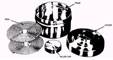 Figure 10-4. Roll film processing tank and reel. (fig. 10-3). They are constructed of perforated metal or plastic and channeled to receive and suspend film in solution. This allows the solution to circulate freely over the film surface. Sheet film hangers are used in tank developing and their use is described later in the this chapter. ROLL FILM TANKS AND REELS Hand processing of roll film is usually done on reels in roll film tanks. The center-feed reel and tanks used most commonly in the Navy are made of stainless steel. The film is wound onto a spiral reel. The reel is then placed into a tank for processing (fig. 10-4). TRAYS Trays used for processing photographic film (roll or sheet) are the same as those used for processing photographic prints. They may be made of any material that is not affected by, or cause contamination of, photographic solutions. Most trays used today are made of stainless steel or plastic. |