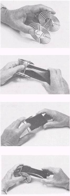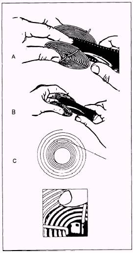 Figure 10-16. Leading 35mm film on wire reel. There are three ways of loading a center-feed spiral reel. You should practice each method (with a dummy roll), both in white light and in total darkness, and select the method that is most comfortable for you. Then perfect that method. Although the three methods are similar, there are differences that may make one method easier for you. However, before beginning one of these methods, make sure that both the reel and your hands are clean and dry. First method. Remove the film from the cassette (35mm) or separate it from the paper backing (120 or 220). The film must be handled only by the edges to prevent scratches and fingerprints. (When you work with 35mm film, the tongue of the leader must be cut off to make a square end before loading the reel.) For 35mm film, if the film was not completely rewound into the cassette, cut the tongue off and leave the film in the cassette. Hold the reel to be loaded in your left hand with the spiral wire ends at the top, pointing toward the right. Allow about 3 more inches of the paper backing to unroll. Bow the film and place it straight into the reel core. Smoothly and slowly turn the reel counterclockwise, guiding the film onto the reel. Allow the paper backing to unwind as the film is wound onto the reel. When all but about 3 inches of the film is on the reel, you will feel the end of the film taped to the paper backing. With 35mm film in a cassette, the film stops unrolling from the cassette when the end is reached. When you feel the tape or the end of the film is about 3 inches from the reel, carefully separate the film from the paper backing or cut the 35mm film right next to the cassette, being careful not to pull the film from the reel. Finish loading the reel. The paper backing on 220 roll film does not run the full length of the film as does 120 film. The paper backing on 220 film serves as a leader and tailer that are taped to the ends of the film. Therefore, when using the third method described above, you must remove the paper tailer from the film before loading the reel. Before processing film using a reel, you must practice loading it by using a roll of practice film in white light, then repeating the procedure in total darkness until you feel comfortable and do not damage the film. Only after you have the reel(s) loaded properly, should you think seriously about processing. When a roll-film tank is used to process fewer rolls of film than the tank can hold, you must take up the extra space in the tank with enough empty reels to fill the tank. The empty reels go into the tank on top of the reels holding the film. When you are pouring solutions into the tank, completely cover ALL the reels in the tank. When processing with a roll-film tank that has a lighttight cap, you can add or dump the chemicals without removing the cover. Only one tank is needed because the required solutions are poured out of and into the tank through the tank cover during processing. This can be done in white light. The chemicals should be arranged in the darkroom sink from left to right (developer, stop bath, etc.) and be