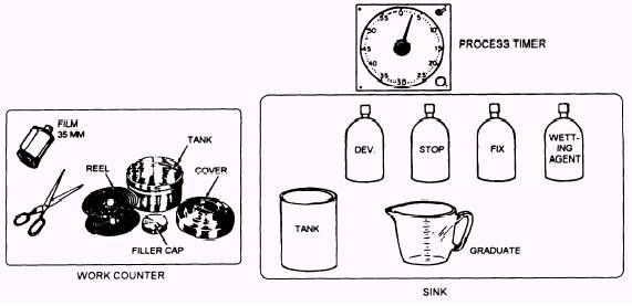 Figure 10-18. Arrangement of materials for processing film. brought to the correct processing temperature in a water bath (fig. 10-18). A clean, dry area should be provided on the work counter for loading the film onto the reels. The following steps are used to process roll film in small tanks: 1. Load the reel or reels with the film to be processed. 2. Place the loaded reels into the tank. If the loaded reels do not come to the top of the tank, add empty reels to take up the space. Place the cover and cap on the tank. The lights may now be turned back on. Once the lights are on and before the film is fixed, be careful not to remove the tank cover or the film will be exposed to light and ruined. 3. Hold the tank in one hand and tilt it slightly; pour the developer directly from the graduate into the tank through the light trap pouring hole. Pour as fast as you can without spilling. As the developer nears the top of the tank, hold the tank level or set it in the sink. Fill the tank to just overflowing. This step should take about 10 to 20 seconds, depending on the tank size. 4. Once the tank is full, immediately start the timer, replace the cap, and strike the tank on the edge of the sink once or twice to dislodge any air bubbles. Now agitate the film by inverting the tank slowly end to end (fig. 10-19). The initial agitation should be 30 seconds. Place the tank in the sink on its bottom (cover up). 5. Once every minute, agitate the film for 5 seconds by slowly inverting the tank end to end. After each agitation cycle, place the tank back in the sink. If you are holding the tank during the entire developing period, the heat from your hands may heat the developer and produce unpredictable results. 6. When only 10 seconds of developing time remain, remove the cap from the tank cover. Immediately start pouring the developer out of the tank through the light trap pouring hole. Dump the chemicals according to local instructions of the imaging facility. This step should take about 10 seconds to complete. 7. When the developer has been emptied from the tank, fill the tank to overflowing with stop bath. The stop bath must be poured into the tank through the light trap pouring hole in the tank cover. Replace the cover cap. Agitate the film in the stop bath for about 30 seconds using the end-for-end method. 8. When the stop bath portion of the process is complete, pour the stop bath through the light trap pouring hole in the tank cover. 9. With the tank cover still in place, pour fixer into the tank and replace the cap. Dislodge the air bubbles and set the timer to the required fixing time. Start the timer and agitate the film using the same agitation as the developer. 10. When the prescribed fixing time has elapsed, remove the tank cover and pour the fixer from the tank back into the bottle from which it came. Never pour the