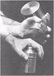 Figure 10-19. Agitation of a small tank. fixer into the sink. The fixer can be reused and then later saved for silver recovery. 11. The film can be washed either in the tank or in a roll-film washer. When the tank is used, insert a hose down through the center of the reels until it is about 1/2 inch from the bottom of the tank. Adjust the water (at the same temperature the film was processed) so a steady overflow is created. Wash the film for about 20 minutes. When you use a rapid roll-film washer, again, adjust the water temperature and place the reels containing the processed film into the washer. Adjust the rate of water flow until the reels start to turn. When the reels start to turn, adjust the rate of water flow until the reels stop turning. Set the timer and wash the film for about 5 minutes. 12. While the film is washing, rinse the processing tank, tank cover, and cap with clean water. Fill the tank with water (check the temperature) and add the wetting agent. After the film has been washed, place the film, still on the reels, into the wetting agent solution. Replace the tank cover and cap and agitate the film in the wetting solution very S-L-O-W-L-Y for 1 minute. 13. After 1 minute in the wetting solution, remove the loaded film reels from the tank. (Do not save the wetting solution.) 14. To dry the film, attach the end of the film to a film clip in the drying cabinet. Let the film unwind from the reel as you slowly lower the reel. When the film is unwound, depress the grip clip (if the reel has one) or remove the film from the core of the reel. Squeegee the film and attach a second film clip to the lower end of the film. Close the drying cabinet door and dry the film. |