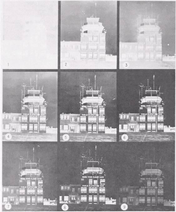 When the film is overexposed and normally developed, as in No. 8, the highlights in the image show a loss of detail. Giving the overexposed film less than normal development may save some highlight detail, but it also reduces the contrast. When the overexposed film is overdeveloped, as No. 9 was, all highlight detail is destroyed and the contrast is also reduced.
