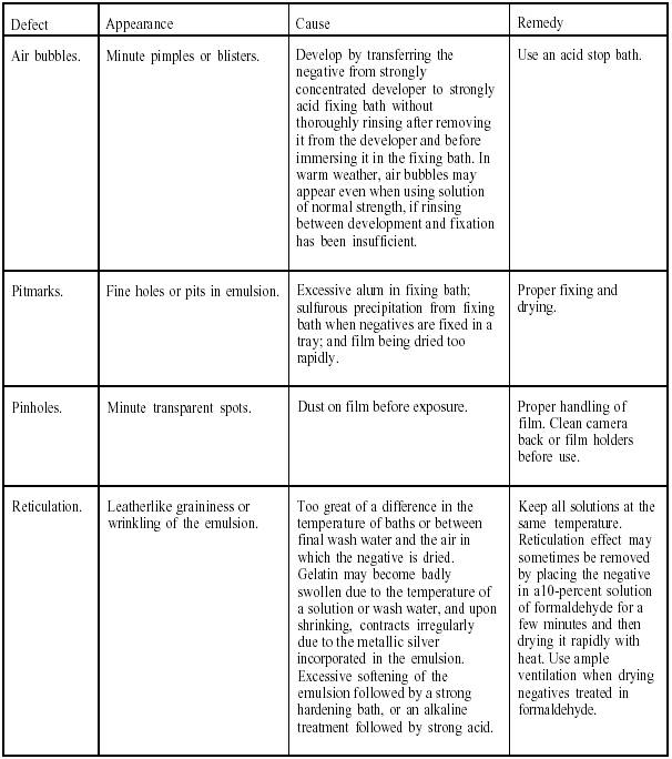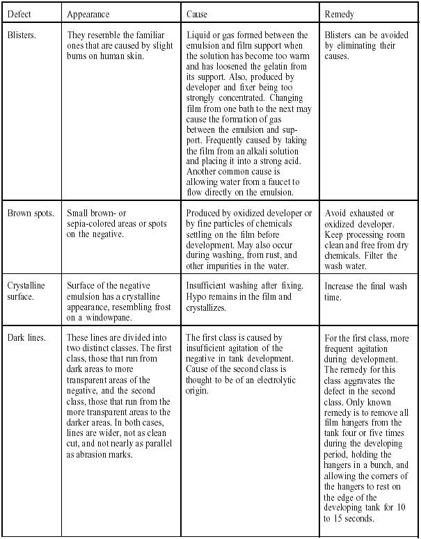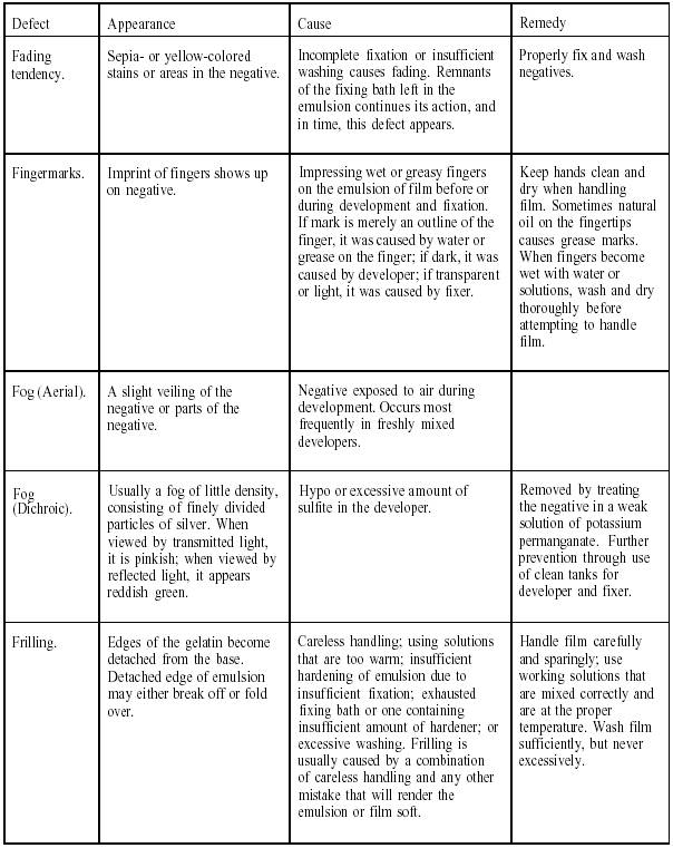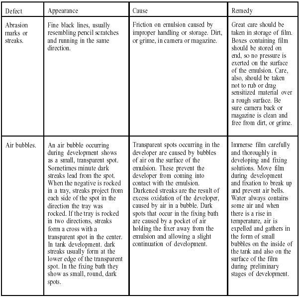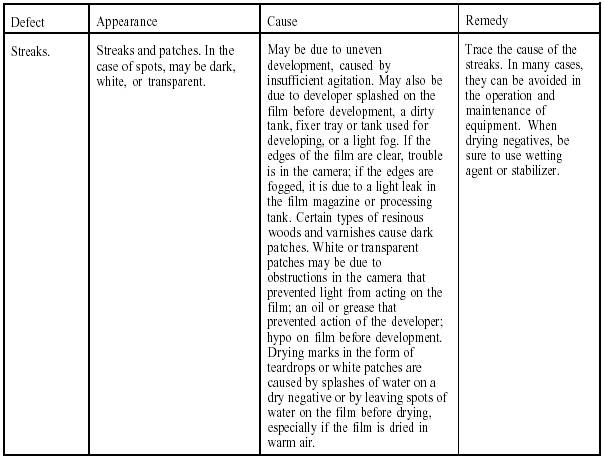 Table 10-1 is a listing of defects that commonly occur in film processing. The appearance, the cause, and the remedy for each of the defects listed are also provided.