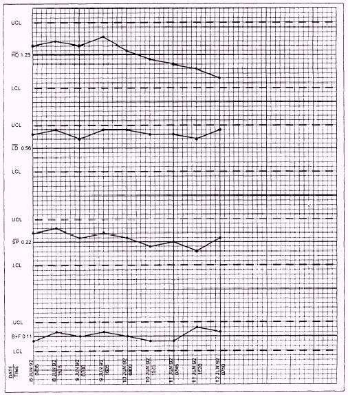 A process control chart provides a visual representation of a process. Control strips that are processed and read on a densitometer are then plotted on a control chart. The points plotted on the graph indicate what has occurred in the process at the time the control strip was processed. Through the use of control charts, a determination can be make whether the process is operating normally. As stated before, only selected steps of a control strip are monitored. For black-and-white film, the minimum steps monitored are as follows: base plus fog (B + F) or gross fog, high density, low density, speed point, and contrast. For each step monitored on a control chart, there are three lines. The center line represents the mean (X) (pronounced bar X ), or average, a top line that represents the upper control limit (UCL), and a bottom line that represents the lower control limit (LCL).