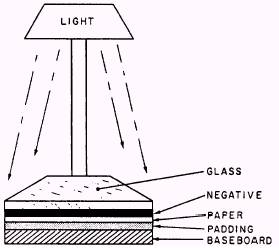 Figure 11-2. Contact printing arrangement. source, and some sort of padding. For large volume and fine printing control, a specially designed and constructed contact printer is used Glass and Pad For you to make contact proof sheets and an occasional contact print job, only a glass and a supporting pad are necessary. Contact printers, consisting of a sheet of glass hinged to a metal frame and a pad assembly, are generally known as proof printers (fig. 11-1). When such a device is not available or is not large enough for the negatives to be contact printed, a piece of 1/4-inch plate glass and soft padding (such as a rubber typewriter pad) can be used. Quarter-inch plate glass is heavy enough to keep the negatives and paper flat and in contact during exposure. The glass must be free of flaws, scratches, bubbles, and dirt. For color contact printing, the glass should be water white or crystal grade; otherwise, filtration is required to overcome the color tint of the glass. The edges of the glass should be beveled and the corners slightly rounded or taped. This is a safety measure to prevent cuts when the glass is being handled. The pad should be at least as large as the glass. The pad provides a cushioned surface to press the paper and negative together under pressure from the glass. To use either the proof printer or the glass and pad to make contact prints, you should place the printing paper emulsion side up on the pad material. The negatives are then placed emulsion side down on the paper and the glass is positioned on top. Then turn on