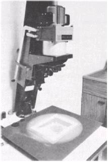 Figure 11-3. Using an enlarger as a light source for contact printing. the exposing light (fig. 11-2). This, of course, is done in the darkroom under suitable safelight illumination. Adequate pressure must be kept on the negative and print paper so their entire surfaces are in contact during the exposure. Any separation between the negative and the paper results in an unsharp point in the image. The light source may be any controlled lamp for printing with a proof printer or glass and pad. An overhanging light bulb or a safelight, with the filter removed, connected to a timer is a convenient arrangement. In most Navy imaging facility print rooms, an enlarger is used as the light source (fig. 11-3). Contact Printer For large volume contact printing, a contact printer is more convenient. A contact printer is basically a box with exposing lights, safelights, and viewing lights inside with a glass top. It has a hinged pressure cover to hold the negative and paper in contact during exposure. Switches on the printer control the lights in the printer or the printer may have a built-in timer. Also, the contact printer may be connected to an external timer. Contact printers are all built around the same basic idea. However, consult the manufacturer's instructions that accompany the contact printer for specific operating instructions. A useful feature on contact printers is an adjustable masking device. This device is attached to the printer so it fits snugly over the printing glass. The mask consists of thin metal leaves used to frame the negative. These blades make it possible for the prints to have white borders or margins. To produce prints with white borders when using printers that are not equipped with a masking device, you can use hand-cut masks from thin, black paper. The basic steps necessary for you to produce a print when using a contact printer are as follows: Place the negative emulsion side up on the printing glass. Place the paper emulsion side down over the negative. Bring the platen or pressure cover down into the printing position. Turn the printing light(s) on for the required exposure time. Release the platen, and process the paper. When you are viewing the negative under a white light, it has a shiny side and a dull side. The shiny side is the film base; the dull side is the emulsion side. A similar examination of photographic paper under a safelight shows that the paper has a shiny side and a dull side. In this case, the shiny side is the emulsion side; the dull side is the paper support. Photographic paper normally has a slight curl toward the emulsion side, although this is not true in all cases. To make contact prints, you must place the dull side of the negative in contact with the shiny side of the paper; that is, they must be emulsion to emulsion. If the negative base is in contact with the paper emulsion, the photograph will be reversed. In some cases, such a reversal in the print is not easily seen, but it becomes strikingly clear when there are letters or numbers in the picture. |