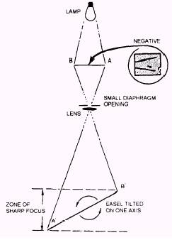 Figure 11-17. Distortion corrected by tilting the easel. DISTORTION CONTROL When you tilt the camera upward to make a picture of a tall building, the vertical lines converge and the building walls seem to be at the point of collapsing. A view camera is equipped with movements that allow the film to be parallel, or nearly so, with the subject, in spite of the viewpoint; however, most of the negatives you print probably are not made with a view camera. Many negatives show an undesirable, noticeable convergence of lines. Changes in these images can be made by tilting the head on some enlargers or by tilting the easel and paper to correct image distortion (fig. 11-17). Most enlargers have an easel separate from the enlarger. Because the easel is separate, it can be tilted by blocking it up on one end. A small diaphragm opening (high f/stop) must be used to increase the depth of focus to include both the part of the easel nearest the lens and the part of the easel farthest from the lens. Within the limits of what you can keep in focus, you can correct some or all of the distortion. With some enlargers, you can tilt the negative carrier by propping up one side with one or more coins. One big disadvantage of tilting the easel is that an extremely small diaphragm opening must be used for depth of sharp focus. The use of a small diaphragm opening makes focusing and composition difficult. This makes it necessary to use long exposure times. |