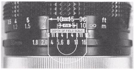 Figure 1-30. Depth of field on camera focusing ring. The terms object focal distance and image focal distance are often used for these conjugate distances. It is obvious from these two terms that the object distance is outside the camera and the image distance is inside the camera. Since the focal length denotes only the distance from its center to the image when focused at infinity, we need some way to account for the fact that when we focus on closer objects the image focal distance can be much more than the lens focal length, with a corresponding effect on image size, effective aperture, and other factors. The various ratios between image and object focal distances may be determined by a formula that contains the focal length of the lens and the ratio (scale) between the image size and the object size. That is: F = the focal length of the lens R = the ratio between the image and object size or the ratio between the conjugate foci of the image and object When R is determined by the following formula: