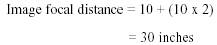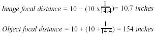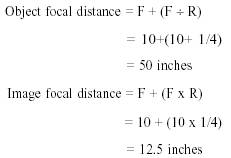 and the image focal distance is as follows: 50mm + (50mm x 1) = 100mm When the image formed by a lens is smaller than the object, the larger conjugate is outside the camera. When the image formed is larger than the object, the larger conjugate is inside the camera. These conjugate focal distances have some interesting relationships that may be used in several ways. The following examples illustrate the practical value of these distance relationships: EXAMPLE 1: A4x5-inch copy negative must be made of a 16x20 print using a camera equipped with a 10-inch focal length lens.