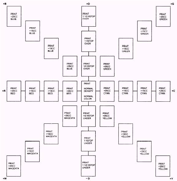 Figure 12-4. Ring around. 590 lux (130 footcandles 55 footcandles). The color temperature of the light source should be between 3800 K and 5000 K. The most important characteristic of the light source is the color rendering index (CRI). The CRI is a scale from 0 to 100 and is used to describe the visual effect of a light source on eight standard pastel colors. For good color rendering in the prints being viewed, the CRI of the light source should be between 85 and 100. Fluorescent tubes, such as the Westinghouse Living White or the Deluxe Cool White tubes (made by several manufacturers), have at least a CRI of 85 and a color temperature near 4000 K. Satisfactory results also can be obtained by using a mixture of incandescent and fluorescent light. For each pair of 40-watt Deluxe Cool White fluorescent tubes, a 75-watt frosted tungsten bulb should be used. Ring Around Comparing the test print to a series of prints that vary from a standard print (correct density and color balance) in known amounts is a simple method of determining color and density correction (fig. 12-4). Comparing your test print to a ring around is particularly helpful when your test print is far from being correct. When using a ring around, you should match the test print as closely as possible to one of the prints. The amount and color of filtration you should add or subtract from the filter pack are the same as indicated on the ring around. When the test print is reasonably close to being correct, you can predict the final exposure conditions accurately. Once again, remember how exposure affects the three dye layers of the paper. That will simplify the choice of selecting the correct filtration. Color Printing Viewing Filters When a test print is reasonably close to the desired color balance, viewing it through color printing viewing filters helps to determine what color change is needed. Color printing viewing filters come in six filter colors: red, green, blue, cyan, magenta, and yellow. Each color is represented in 10, 20, and 40 density values. To use a filter, hold it several feet away from the print and light source. Quickly flick the filter in and out of your line of vision to see the color correction the filter makes. Since these filters tend to overcorrect the highlights and undercorrect the shadows, you should view the lighter middle tones through the filters to determine the desired color balance. Try several filters of different values and colors when evaluating a test print; for example, when the print looks cold to you, evaluate it through a series of red, magenta, and yellow filters to determine whether the color in excess is cyan, green, or blue. Similarly, viewing a warm print through cyan, green, and blue filters will determine whether the color in excess is red, magenta, or yellow. Since the contrast of print materials is fairly high, a filter used in exposing a print tends to produce a greater change in color balance than the visual effect of viewing a print through a filter. In general, the filtration change to the filter pack should be one half of the viewing filter that makes the lighter middle tones of the test print appear correct; for example, you have determined that when viewing a test print through a 20CC green filter, the color balance looks correct; therefore, you would make a 10CC change to your filter pack Suppose, again, that the test print is too blue; that is, not enough yellow dye was produced. The print will look best through a 10CC yellow filter. Since blue light creates yellow dyes, we must increase the amount of blue light reaching the paper by 05CC. You should do this by subtracting 05CC of yellow filtration (for subtractive printing) or subtracting 05CC of blue filtration (for additive printing). When a 20M filter is best for viewing, subtract 10CC G (additive printer) or 10M (subtractive printer) from the pack to produce the desired correction. |