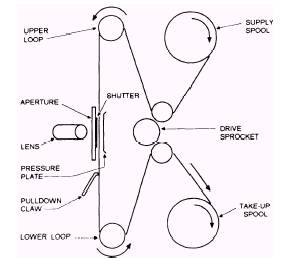 - MOTION MEDIA Motion media has gone through many technical advances in the past several years. Portable motion-video cameras have changed from cumbersome cameras and recording packs to small hand-held cameras. Reduced size, improved quality, and easier operation has, and is continuing to improve and expand motion video in all areas of the Department of Defense. Most Navy ships have closed circuit television systems for information, entertainment, and educational purposes. Motion media is distributed easily and dominates all other sources of communication in today's society. Because of this, the Navy uses this form of communication extensively to relay information. The most common form of motion-media photography is video. Since the motion picture is the grand-father to the technology of motion media as we know it today, it is discussed briefly in this chapter. MOTION PICTURE The first fact regarding motion pictures is they do not move. Each image or frame of motion picture film is a separate, still photograph. These individual images or frames are normally recorded at a rate of 24 separate pictures per second. This rate can be varied to achieve certain effects. Since so little time passes between exposing one frame and the next, there is relatively little difference between pictures, even when the subject moves rapidly. The illusion of motion in motion-picture photography is due to the natural characteristic of human vision. This characteristic of human vision is called persistence of vision. Persistence of vision was discovered by Peter Mark Roget, the author of the famous Thesaurus. The retina of the eye continues to perceive an image for a short period of time after the light stimulus representing the image has been removed. Usually, this after image lasts about 1/50 second, depending on the brightness of the image. In viewing a motion picture, the eye continues to perceive the fading image projected from one frame as it is replaced by the next frame, and so on. In effect, the images are momentarily superimposed in our vision, so any differences between them, however slight, are mentally noted. If these differences suggest any relative change in subject position, the apparent difference is mentally interpreted as motion. The mind translates this information into the logical deduction that whatever we are seeing on the movie screen must be moving. CAMERAS Since motion pictures are a series of still pictures, the motion-picture camera is basically the same as the still-picture camera. The primary difference is that it has a mechanism for taking a series of many photographs in rapid succession and at regular intervals on a ribbon of film. All cameras have the following four basic parts: a lighttight compartment, a lens or lenses, a shutter, and a film plane or pressure plate. The motion-picture camera has two additional basic features; the film drive and intermittent action. The film drive mechanism transports the film continually from a supply spool of unexposed film to a take-up spool of exposed film. This transport takes place by means of toothed, drive sprockets. The teeth of the drive sprockets engage the perforations along the edge of the film and move the film through the camera. The intermittent action in a motion-picture camera is caused by a pulldown claw that advanced the film one frame at a time at the film gate. During one cycle of operation of a motion-picture camera, the following action takes place. The film is advanced by the sprocket drive mechanism. The pulldown claw or shuttle then advances the film one frame. The film is stopped momentarily and the shutter revolves once, thereby making the exposure. The pulldown claw then moves the film to the next frame for exposure. Because the film moves in an intermittent or stop-and-go manner, it becomes necessary to have a surplus or loops of film before and after the pulldown claw to help take up the
