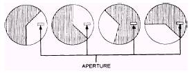 Figure 13-2. Rotary shutter. shock and prevent the film from breaking (fig. 13-1). The shutter in most motion-picture cameras is a focal plane type and is called a rotary disk shutter. A rotary disk shutter is a disk that has a segment cut out, causing the shutter to have a light and dark cycle as it rotates. Exposure is made when the cutout segment of the shutter passes in front of the film. The film is advanced during the dark cycle (fig. 13-2). A motion-picture camera is used to photograph action in a rapid succession of still pictures on a long strip of film. Each picture area on a motion-picture film is called a frame, and the speed that the camera is operated is called frames per second (fps). The standard operating speed for 16mm cameras is 24 fps. When the camera operating speed and the rate of projection are the same, the action looks normal; therefore, the standard projection speed is also 24 fps. However, it is possible, and sometimes desirable, to make motion pictures at a slower or faster rate than 24 fps. You may do this to either slow down or speed up the action on the screen. To portray a subject in slow motion, you operate the camera at a speed faster than the standard 24 fps, but keep the projector at the standard speed. To portray a subject in fast motion, you operate the camera at a speed slower than 24 fps, and the film is projected at 24 fps. All changes to the portrayal of normal subject motion should be done by adjusting the camera speed, not the movie projector. Camera speeds in the thousands of frames per second are used in scientific and experimental research to measure and observe such things as the fall of liquids, the speed of objects in flight, and the bursting characteristics of objects. When films shot at very fast fps rates are projected at 24 fps, the illusion of subject motion on the screen is slowed down considerably. At these speeds the viewer can study details of the subject matter and obtain research data. Motion-picture cameras are classified according to the size (width) of the film they use. The most common motion-picture film sizes are as follows: 8mm, super 8, 16mm, and 35mm. In the Navy today, motion-picture film has almost been completely replaced with video film; however, Hollywood productions still use motion-picture film as large as 70mm. Lenses used in motion pictures are basically the same as lenses for still photography; therefore, the information on optics presented in chapter 1 also applies to motion-picture camera lenses. The standard or normal focal length lens for a 16mm camera is 1 inch (25mm). Longer or shorter focal length lenses should be considered as long focal length (telephoto) or wide-angle lenses, respectively, depending on what size film is used. A long focal length lens for 16mm film is 38mm or longer. A wide-angle focal length lens for this camera is 13mm-17mm. Table 13-1 illustrates some typical camera and lens combinations. FILTERS With one exception, the use of filters for motion pictures is the same as for still photography. The effects that filters produce on motion-picture film emulsions are the same as the effects they produce on still photographic film emulsions. The one exception is the use of a polarizing filter. Camera panning should be avoided because variable darkening of the image results. The information on filters presented in chapter 3 applies to motion-picture photography as well as still photography.