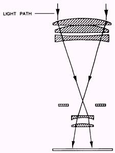Figure 1-35. Arrangement of lens elements in a telephoto lens. focal length. With a normal lens, the angle of view and the image size you see in the viewfinder are normal. That is, you get much the same impression as you would get if you look at the subject with one eye. Many Navy photographers claim, however, that the wider angle of view of a 35mm lens (for a 35mm camera) is preferable. Others maintain that an 85mm focal length is better for general use because it enables the picture space to be filled more easily with subject matter. A normal lens can be used for making pictures of people if you do not get too close. When you fill the frame with the face of the subject, you get image distortion. It is better to stand farther back and include the shoulders of the subject in the picture. This eliminates distortion. |