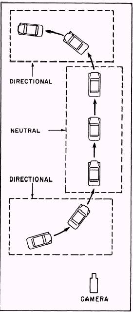 Figure 13-11. Showing a change in screen direction. A shot can start as a neutral shot and transition into a directional shot, or vice versa; for example, start with a head-on shot of a car and continue filming as the car turns to the right and exits the frame, or start with a direction showing a shot of the car entering the frame from the left, and continue filming as the car turns left to a tail-away neutral shot (fig. 13-11). These types of