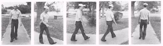 Figure 13-12. Showing change of screen direction. shots can be used to change screen direction by temporarily showing a neutral condition between two shots when the subject moves in opposite directions. Tracking shots are accomplished by moving the camera directly ahead or behind the subject, either leading or following the subject, respectively. As with head-on or tail-away shots, tracking shots are neutral only when the subject is not shown entering or leaving the frame and when only the front or back of the subject is shown. High-or-low camera angle shots-The subject moves directly toward and under or over the camera so, the subject exits at either the bottom or the top of the frame. Examples: a train, shot from a high-camera angle, may move directly under the camera and exit at the bottom of the frame, or an aircraft may take off and move over a low-angled camera and exit at the top of the frame. Subjects traveling abreast shots-Two or more subjects move directly toward the camera and split up to exit the frame on both sides of the camera, or enter the frame on both sides of the camera and join up, moving directly away from the camera. A neutral shot inserted between two shots of a subject moving in opposite cross-screen directions distracts the audience momentarily to allow for the change in direction. To open a sequence, you can use a head-on shot to bring a moving subject from a distant point toward the audience. To close a sequence, you can use a tail-away shot of a subject moving away from the camera. Shots, such as these, present moving images that increase or decrease in size and have more of an effect on apparent depth than do cross-screen movements. Head-on and tail-away tracking shots add variety by offering a change from the usual three-quarter side shots. Head-on shots tend to produce greater audience impact because the audience is placed dead center with the action advancing toward them. |