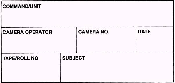 Figure 13-16. The slate. required to put the new car together, you probably would not be entirely grateful. Maybe you could assemble it (if you were an experienced mechanic), but you know that more information would save you time, frustration, duplication of effort, and help tremendously toward a successful outcome. On the other hand, if every part were clearly identified and the exact relationship to every other part was unmistakably described, you would certainly appreciate the gift much more. Being faced with several thousand feet of unidentified videotape is very much the same kind of situation. The biggest problem encountered by imaging personnel in the Department of Defense during Operation Desert Storm was the lack of identification of exposed imagery. There were literally boxes of film and videotape lining the passageways in the Pentagon. Most of this imagery was of little value because it was not identified, or it was labeled inaccurately. Accurate records are almost as important as good video coverage in achieving a professional product. Imaging products must be labeled, so the subject matter and subject location are easily identifiable on the tape. Often, there is no opportunity for personal contact between the cameraperson and editor; therefore, records identifying the filmed image content are the only information available. Logically, the better the records, the more useful the videotape. The opposite rule is also true. Inaccurate records can make the video coverage useless. Do not let that happen to your work. |