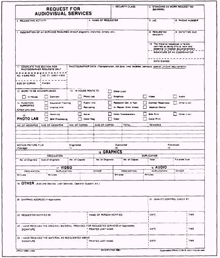Figure 14-2A. OPNAV 5290/1 (Front). VISUAL INFORMATION JOB-ORDER FORM ALL work performed by Navy imaging facilities must be documented on a job-order form. The job-order form is used to maintain close control of in phases of imaging services. The job-order form serves several purposes; they are as follows: as an official request for visual information (VI) services, as the authority to perform the work, as a record of the time and materials used to complete the job, and as a receipt for the finished work. Navy imaging facilities may use the Request for Audiovisual Services, OPNAV 5290/1 (fig. 14-2A), or a locally created, in-house job-order form. As a minimum, an in-house job-order form must contain the following information: a job-order number, a customer signature block with a disclaimer that the service requested is official work and essential to mission accomplishment, product security classification, and any other information required by your facility to accomplish the request officially.