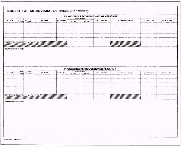 Figure 14-2A is an example of an Request for Audiovisual Services, OPNAV 5290/1. Figure 14-2A shows the front side of the form. The front side can be broken down into two sections. The top section, Blocks 1 through 14, may be completed by the requester or a person assigned to the job-control desk by the imaging facility. The completion of these blocks is self-explanatory. Block 2 (the work request number) is the