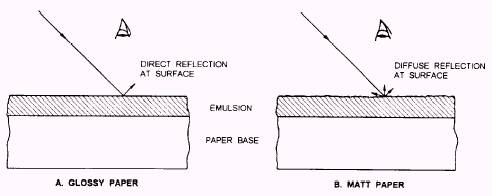 Figure 2-9. Reflection of light of different surface paper. handled in total darkness or under safelight conditions specified by the manufacturer. Unexposed light-sensitive materials deteriorate slowly with time even when the materials are stored under ideal conditions. High temperatures and high relative humidity accelerate this deterioration. You should protect light-sensitive materials from the harmful effects of temperature, humidity, x rays, gases, and vapors that may be present in darkrooms, transport, and adverse storage conditions. Storage instructions are printed on the packaging materials of most photographic products. Kodak papers and sheet film are packaged in humidity-sealed boxes to protect them from changes in relative humidity (RH). Keep these materials in their original packaging until you are ready to use them. When the RH gets at 60 percent or higher for long periods of time, not only do cardboard packages, labels, and metal containers become damaged, but mold, fungus, and bacteria start to grow. Fungi can destroy film and paper by digesting the gelatin in them. Ideally, film and paper should be stored below 50 percent RH. The usable life of a light-sensitive material varies with the type of material, but generally, color materials deteriorate more rapidly than black-and-white materials, and black-and-white materials with high-speed emulsions deteriorate more rapidly than black-and-white materials with slow-speed emulsions. Cold storage in a refrigerator or freezer is recommended for all light-sensitive materials; however, refrigerators and freezers that contain food or unsealed containers of liquids have a high relative humidity. Therefore, food should never be stored in the same refrigerator as film and paper. Paper and professional film should be stored at about 50F (10C) or lower in the original sealed package. All film, including amateur film, must be protected from extreme heat. Never store photographic materials in extreme heat, such as in a glove compartment, trunk, or the back window of a car. Once opened, the original package should be used as soon as possible. After opening, the materials are no longer protected from humidity or chemical fumes. When film or paper, black and white or color, is removed from cold storage into a warmer atmosphere, allow a warm-up time before opening the original packaging; otherwise, moisture condensation may form on the film or paper. The warm-up time for light-sensitive material depends on the type of material packaging, the size of the package, and the amount of material. The warm-up times for packages of paper is considerably longer than for film. Paper is usually packaged in larger quantities, 100 to 500 sheets per box and in rolls up to 1,000 feet long. Short roll film and magazines take 1 to 1 1/2 hours to warm-up. Large packages and rolls of film and paper should be allowed to warm-up to room temperature overnight or about 10 hours. |