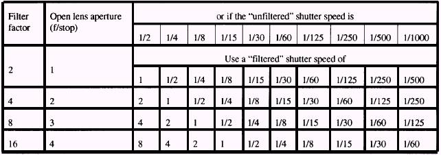 Filters function by absorbing a portion of the light reflected from the subject to the camera. To compensate for this absorption and the loss of light, you may have to increase the exposure to compensate for the light absorbed by the filter. A numerical value is assigned called a filter factor or multiplying factor. This numerical factor is based on several variables that include the color sensitivity of the film, density of the filter, color of the filter, and color temperature of the light source. As these variables change, the filter factor also changes to produce the correct exposure consistently. Filters are often identified as 2 X yellow or 4 X orange. That implies that the filter factor is 2 and 4, respectively. Remember, the filter factor does not always remain constant when conditions change. For example, a blue filter used with panchromatic film exposed with daylight requires a smaller filter factor than when the same film and filter are used with tungsten light. The reason for this is daylight has a higher content of blue light that is readily transmitted by the blue filter. Thus, with the same film and filter combination and with the same camera shutter speed and f/stop, more exposing light is available at the film plane with daylight as compared to tungsten light. A filter that absorbs a great amount of illumination from a given light source is assigned a larger filter factor. A filter that absorbs a lower amount of illumination from the same light source is assigned a smaller filter factor. To obtain the necessary light at the film plane for correct exposure with a filter, you must increase the original calculated exposure (without a filter). This increase in exposure is determined with a filter factor. When a filter has a factor greater than 1, an adjustment to the exposure must be made. There are three general methods of using filter factors to determine the exposure increase required: 1. Divide the ISO speed by the filter factor, and use the product as the effective film speed. Example: If the filter factor is 2 and the IS0 speed of the film is 100, the effective film speed is 50 (100 + 2 = 50). Thus setting a film speed of 50 on your light meter produces the equivalent of 1 f/stop of additional exposure. 2. Determine the required exposure without the use of a filter; then multiply the unfiltered shutter speed by the filter factor. Table 3-6. Filter Factor Equivalent Exposure Table