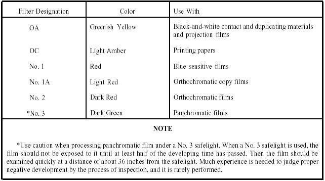 No types of filters are used almost exclusively in the photographic darkroom. They are safelight filters and printing filters. The printing filters include variable contrast filters for printing black-and-white materials and color printing filters for printing color materials. SAFELIGHT FILTERS The word safelight in photography is used to describe filtered tungsten illumination or direct illumination from a sodium-vapor lamp. The color of a sodium-vapor lamp does not affect (expose) light-sensitive materials under prescribed darkroom conditions. The word safe is misleading since light-sensitive materials are never completely safe from safelight illumination. The use of a safelight with some types of light- sensitive materials is not recommended Compatible safelight filters for use with certain light-sensitive materials should be selected on the basis of color sensitivity and emulsion speed of the material. The best method of selecting a darkroom safelight filter is to use the filter recommended by the manufacturer of the light-sensitive material. Safelight filters absorb that portion of the visible spectrum produced by a tungsten lamp that would affect the light-sensitive material being handled. Sodium-vapor lamp safelights use sodium gas to provide safelight illumination. Incandescent sodium gas produces a very narrow band of visible light in the yellow-orange portion of the spectrum. Colorblind printing papers are not sensitive to this monochromatic (one color) band of light, whereas the human eye is very sensitive to it. Therefore, a brighter print room is possible without the light affecting the printing paper. By using specially designed filters that further reduce the narrow band of sodium-vapor light, black-and-white materials sensitive to green and red light can be handled under this illumination. Table 3-7 provides some examples for the application of safelight filters. Always consult the Photo-Lab-Index to determine the best safelight for use with various light-sensitive materials. VARIABLE CONTRAST PAPER PRINTING FILTERS To obtain various degrees of contrast using variable contrast printing papers, use a series of magenta and yellow filters. The magenta filters are used to print black-and-white negatives that are low in contrast. Table 3-7. Safelight Filters