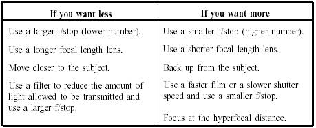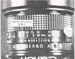 Use a larger f/stop (lower number). Use a longer focal length lens. Move closer to the subject. Use a filter to reduce the amount of light allowed to be transmitted and use a larger f/stop. Use a smaller f/stop (higher number). Use a shorter focal length lens. Back up from the subject. Use a faster film or a slower shutter speed and use a smaller f/stop. Focus at the hyperfocal distance. f/16 but focusing now at about 16 feet, the depth of field is almost at infinity. Most normal lenses for 35mm cameras produce these maximum ranges of sharpness at about 16 feet. Focusing any farther from the camera only reduces foreground sharpness. You must remember this point when attempting to get the greatest possible depth of field. Lens focal length is also a factor in depth of field. The shorter the lens focal length, the greater the depth of field at a given aperture. In other words, a wide-angle lens provides more depth of field at f/8 than a normal lens, and a normal lens provides more depth of field at f/8 than a telephoto lens. You know that a small aperture like f/16 provides more depth of field than a wide aperture like f/2. With experience, you can predict the best aperture for the depth of field desired. Even with experience, you do not always have to guess the aperture setting or calculate the hyperfocal distance, near distance, and far distance by using formulas. Most lenses have a depth-of-field scale to guide you (fig. 4-13). The depth-of-field scale indicates the distance range from the camera that the subject(s) appear in acceptably sharp focus. The depth of field on an SLR is marked between the aperture ring and the focusing scale. Use the depth-of-field scale as follows: 1. Focus on the subject. 2. Select the f/stop. 3. Look at the depth-of-field scale and locate the marks that correspond to your chosen f/stop. The f/stop appears twice, once on either side of the scale center line. 4. Read the two distances on the focusing scale that are adjacent to the two f/stops on the depth-of-field scale. You may have to estimate the distances. You can see in figure 4-13 that the lens is focused at a distance of 30 feet with the aperture set between f/16 and f/22. You can see from the depth-of-field scale that the depth of field extends from approximately 11 feet to beyond infinity. If the aperture is opened up to f/8, the depth of field will range from about 16 feet to infinity. At any given aperture, depth of field is maximized by focusing the lens at the hyperfocal distance. That is the closest point of acceptable sharp focus shown on the depth-of-field scale when the lens is focused at infinity. When you are changing the focus setting to the hyperfocal distance, the zone in front of the subject that is sharp is increased, and infinity is still the farthest point