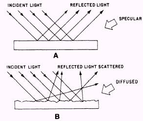 Light waves travel in straight lines. When light waves encounter an object or new medium, they act in one or more of the following ways: They may be reflected. They may be absorbed. They may be transmitted. When light is reflected, it acts in a certain way. When the reflecting surface is smooth and polished, the reflection is orderly, or specular. Specular light is reflected at the same angle to the surface as the light incident to the surface; that is, the path of the light reflected from the surface forms an angle exactly equal to the one formed by its path in reaching the surface. Thus the angle of reflection is equal to the angle of incidence, which is a characteristic of specular light (fig. 1-6, view A). However, when the object surface is not smooth and polished but irregular, light is reflected irregularly or diffused (fig. 1-6, view B); that is, the light is reflected in more than one direction. Practically all surfaces reflect both specular and diffused light; smooth surfaces reflect more specular light, and rough surfaces more diffused light. Since diffused light is more common than specular light, it is of greatest value in photography. Objects that are not light sources are visible and therefore photographic.