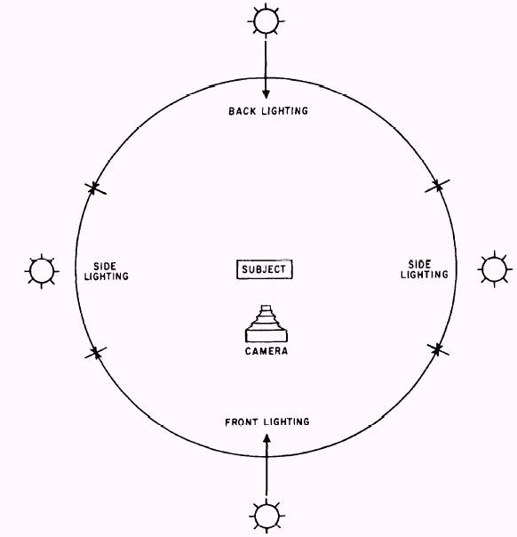 Figure 4-18. Lighting directions. exposed during bright sun on light sand or snow, bright sun, cloudy bright, and cloudy conditions are for scenes that are front-lighted only. The direction of the light source from heavy overcast or open shade conditions does not affect exposure because it is extremely diffused and the direction is not apparent. The amount of light reflected from the scene changes, as the direction of the light changes. As the lighting direction is changed from in front of the subject to behind the subject, the amount of light reflected from the subject is reduced; therefore, depending on the direction from which the light is falling on your subject, you may have to compensate the camera exposure. There are three basic lighting directions with which you must become familiar. These lighting directions are as follows: frontlighting, side lighting, and backlighting (fig. 4-18). Frontlighting. Whenever light originates from behind the camera and illuminates the front of the subject, it is called frontlighting. A subject appears brightest and reflects the most light toward the camera when the subject is front-lighted. Side Lighting. As the camera is moved in an arc away from frontlighting, less light is reflected from the subject into the lens. Whenever the light source has a 90-degree relationship with the camera, the incident light on the subject is called side lighting. In side lighting situations, part of the subject is in shadow. Photographs of side-lighted scenes usually require two times (one f/stop) more exposure than frontlighted subjects when you want detail in the shadows. Backlighting. When the light source is directly behind the subject and aimed toward the camera, it is called backlighting. In back-lighted situations, the subject is in shadow and the light reflected from the subject toward the camera is decreased greatly. A silhouette effect (no shadow detail) of a back-lighted scene is produced by closing down one f/stop from the basic exposure. If shadow detail is desired, an increase of four times (two f/stops) from the basic exposure is required. Reflection Properties Otherwise the intensity and direction of light falling on the subject, the texture of the surface, and the colors and shades of the scene also have an effect on film exposure. SURFACE TEXTURE. Smooth, glossy surfaces scatter or diffuse reflected light very little; therefore, these objects reflect a large percentage of light to the lens. Rough surfaces greatly scatter and diffuse light. Less light from rough surfaces is reflected to the lens. COLORS AND SHADES. Not all light that falls on the surface of a subject is reflected. A brilliant white object reflects a high percentage of incident light, and a black object reflects very little of the light. Between these two extremes are the numerous tones of gray and colors of various hues and brightnesses. Each colored or gray object in a scene reflects a specific amount of light. A scene that consists primarily of light-colored or light-toned objects usually requires an exposure compensation to decrease the exposure as compared to the basic exposure for an average scene. A scene that consists primarily of dark-colored or dark-toned objects usually requires an exposure compensation to provide more exposure as compared to the basic exposure for an average scene. The primary reason light scenes and dark scenes require less exposure and more exposure, respectively, as compared to the average scene, is to maintain detail in the highlight of the light scenes and detail in the shadow areas of the dark scenes. The color quality of a light source also has an effect on the amount of light reflected from an object; for example, a blue object does not reflect as much light when illuminated with a red light source, as compared to the same object being illuminated with a blue light source. This difference in reflectance is caused by the blue object absorbing the reddish light and reflecting the bluish light. Any man-made light is an artificial light source. This light may be a tungsten lamp, a fluorescent lamp, a mercury-vapor lamp, and so on. The same factors that affect exposures for daylight apply to artificial light as well. Artificial light has some advantages. Distance, direction, and color temperature can be controlled using these light sources. |