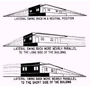Figure 4-22. Correction for horizontal distortion. Bellows. Connects the front and rear standards and allows the two standards to move for focusing or to accommodate various focal-length lenses. Tripod head. Holds the monorail to the tripod. Lens. Ground glass. Used for focusing, viewing, and composing the image. There are four basic movements or adjustments used on a view camera. These basic movements perform specific functions. The four basic movements are as follows: 1. Horizontal or lateral swing. Both the front and rear standards swing horizontally (fig. 4-21). The swing back is used to correct distortion, or perspective, in the horizontal plane. When you are photographing subjects from an angle, horizontal lines appear to converge at the distant side. To correct this distortion, swing the camera back so it is more parallel to the horizontal plane of the subject (fig. 4-22).
