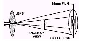 Figure 4-30. Comparing the angle of view of a 35mm camera and the Kodak DCS Digital camera. the chrominance information. This camera provides a 720,000 pixel image. The images can be stored on the floppy disk either as a FRAME or a FIELD. When frame is selected, each picture is recorded on two tracks and up to 25 images can be recorded on each disk. When field is selected, each picture is recorded on only one track, allowing up to 50 images to be recorded. When you record your pictures in the field mode, images are less detailed as compared to images recorded on two tracks (frame). Overtaking the still-video camera is the digital camera. The Eastman Kodak Company is leading the way in digital-imaging technology by introducing the Digital Camera System (DCS). Resolution with the Kodak DCS 200 Digital camera is 1.54 million pixels,