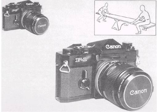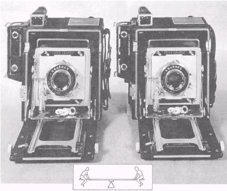 The proper viewpoint or camera angle is an important factor in good composition. Repositioning your subject within the viewfinder frame and changing the camera viewpoint or camera angle are two simple ways of controlling composition. Photographing from a different viewpoint or camera angle can often add drama and excitement or even bring out an unusual aspect of a subject. Most of the subjects you photograph are three-dimensional and should be photographed from an angle (to the right or left of and/or from higher or lower than the subject) that allows the viewer to see more than one side of the subject. The photographer should study the subject from different sides and angles. Walk around the subject and look at it from all viewpoints. See it from elevated and low positions as well as from eye level to find the best composition. This greatly assists in composing the subject for the best balance and helps to select a background that compliments, not distracts from the subject. The terms viewpoint and camera angle are often used in conjunction with one another and sometimes used interchangeably. They can also have different meanings depending on how they are applied. Viewpoint is the camera position in relationship to the subject. "Camera angle" is the angle in which the camera lens is tilted; for example, a picture of sailors marching, made from ground level with the camera held horizontal with reference to the ground, may be referred to as a low viewpoint (or camera position); however, when this picture is made, again from ground level, but with the camera pointed up, it may be referred to as a "low camera angle." Likewise, a picture made from an elevated or high position, with the camera again held horizontal with reference to the ground, or even pointed straight down, can be referred to as a high viewpoint ; however, if the camera is not held horizontal to the ground or pointed straight down, but pointed at some angle between horizontal and vertical, the camera position could be referred to as a high camera angle. Eye-Level Shots With the camera held horizontal, eye-level shots are usualIy made at a height of about 5 1/2 feet, the height from which the average adult sees, and with the camera horizontal. With the camera held at eye level but pointed up or down, the camera position changes and you have either a low or high camera angle, respectively. Low Viewpoint and Low Camera Angle Low viewpoints and low camera angles can add emphasis and interest to many ordinary photographs. A low viewpoint can be used to distort scale or add strength to a picture or to emphasize certain elements within the picture. A low camera angle is achieved when the camera angle is located below the point of primary interest and pointed upward. Low angles tend to lend strength and dominance to a subject and dramatize the subject. Low angle shots are used when dramatic impact is desired. This type of shot is very useful for separating the subject from the background, for eliminating unwanted foreground and background, and for creating the illusion of greater size and speed (fig. 5-7). High Viewpoint and High Camera Angle High viewpoints and high camera angles help orient the viewer, because they show relationships among all elements within the picture area and produce a psychological effect by minimizing the apparent strength or size of the subject (fig. 5-8). BALANCE Balance in photographic composition is a matter of making pictures look harmonious. Each element in a picture has a certain amount of value in respect to all the other elements. Every tone, mass, shape, tree, rock figure, building, line, or shadow contributes a certain amount of weight that must be arranged correctly in the composition to give the impression of balance. The subject placement within the picture area is the factor that must be carefully considered. Composition is kept in balance by two different methods: symmetrical, or formal, balance and asymmetrical, or informal, balance.