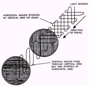 Figure 1-10. Controlling polarized light. when a section of line is secured at one end and the free end is held in your hand and given a shake, a wave travels down the length of the line from the end that was shaken to the secured end just like an oscillator. A light source acts as an oscillator. The wave motion in the line, however, does not represent the true wave motion of light because light waves move in all possible directions at right angles to their direction of travel. A much clearer picture of light wave motion can be seen by having a number of parallel lines with each one being shaken in a different direction-one up and down, one sideways, and the others at various angles in between. Ordinarily, light waves vibrate in all directions at right angles to their direction of travel. However, when light waves strike a series of parallel microscopic slots, all the light that passes through vibrates in one direction. This is polarized light. Filters that polarize light, termed polarizing filters, have a practical use in photography (fig. 1-10). Specular reflected light, from a nonmetallic surface at any angle between 32 and 37, is polarized in such a manner that the light rays vibrate in a direction parallel to the reflecting surface. Light reflected in this manner is said to be plane polarized and is seen as glare (fig. 1-11). There is no polarization whatsoever produced by reflections from metallic surfaces. |